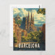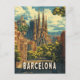Vibrant, colourful travel postcard showcasing the iconic Sagrada Familia in Barcelona. Designed in a flat vector art style with pastel tones and bold colour blocks. Perfect for travel enthusiasts.