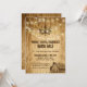 Whiskey Chandelier Barn Sale invitation on wood with barn, chandelier, and string lights