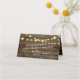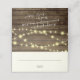 Rustic barn wood and string lights folded seating card with white area for hand writing names and table number and personalized names and message on reverse side.