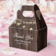 Rustic wood wedding thank you favour box featuring string lights on a barn wood background.