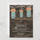 Bois rustique de Barnwood, feux à cordes pendants avec des fleurs de corail dans une bocale de mason invitations mariage. Produits correspondants également disponibles.
