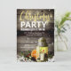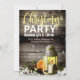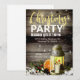 The glowing lantern and string lights on the grey barn wood background creates a warm cozy setting on this festive Christmas party invitation.