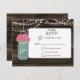 Rustic Barnwood, dangling string lights with pink flowers in a mason jar wedding RSVP. Matching products also available.