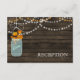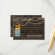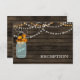Rustic Barnwood, dangling string lights with fall leaves in a mason jar wedding reception invite. Matching products also available.
