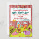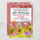 Personalize this birthday party template with your own party details. Features a cute Barnyard Farm Animals theme with a printed red barn wood rustic background. Has a colourful and funny rooster, cow, pig, sheep, barn, windmill, apple orchard, sun, and flowers. The wood is just a printed design, not actual wood.