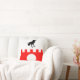 "Per fess embattled argent and gules, in pale a raven, close and sinister facing, sable and a plate argent." Populace badge for the Barony of Raven's Fort in the Society for Creative Anachronism. Back of pillow is a medieval-style pattern in coordinating colours.