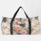 This image showcases a duffel bag adorned with a luxurious and dramatic floral tapestry print, reminiscent of Baroque botanical artistry. The design features a grand arrangement of opulent blossoms in rich shades of dusty pink and blush, complemented by deep teal-blue and muted sage green foliage, all set against a textured, antique cream or pale greyish-beige background with subtle distressed elements. The elaborate details and sophisticated colour palette create a sense of vintage grandeur and intricate beauty. Equipped with sturdy, dark-coloured straps and a secure zipper closure, this bag is a functional yet exquisitely designed accessory, perfect for travel, gym use, or adding a regal, artistic touch to any ensemble.