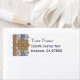 A custom address label with vintage block letters and baroque border of a round element, flowers and a geometric pattern in blue, golds and red, restored from an antique manuscript.