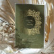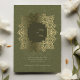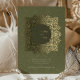 This exquisite wedding invitation features an intricate Baroque ornament design in radiant gold foil against a rich olive green background. The ornate detailing frames the couple’s names and event details, adding a luxurious touch to the overall aesthetic. The reverse side continues the opulent theme with a matching Baroque-inspired pattern, making this invitation perfect for formal weddings that embrace classic elegance and grandeur. Ideal for couples seeking a timeless and sophisticated design, this card is sure to make a lasting impression.