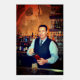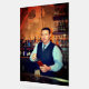 Un barman portant un gilet et une cravate se trouve derrière un bar bien approvisionné, déversant une boisson d'une bouteille. L'arrière - plan présente différents esprits sur d'élégantes étagères en bois et un mur en pierre.