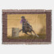 A cowgirl races around the barrels in a rodeo. The look of tooled leather surround it.