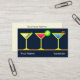 Cute and colourful business card for bartenders or anyone in the mixed drinks business. The front of the card has three martini glasses with coloured drinks. One has a garnish of olives, one has a lime slice, and one has an orange peel twist. Add your name and title on the front, and all your contact information on the back side.
