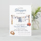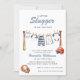 A 'little slugger' is on the way! Celebrate your upcoming arrival with this adorable baseball-themed baby shower invitation. The design features cute baby clothes hanging on a clothesline strung between baseball bats, with a tiny baseball helmet and glove adding to the charm. The classic navy and white stripes on the back complement the sporty theme, creating a cohesive and memorable announcement for your special event. This invitation is perfect for parents who love baseball or are looking for a unique and fun way to celebrate their baby shower.
