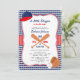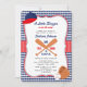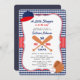 A Little Slugger is on the Way! Cute baseball Baby Shower invitation Blue gingham with red striped band. Perfect for a baseball themed boy baby shower celebration.