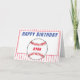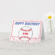 Baseball birthday greeting card for kids. This personalized baseball birthday greeting card has a Happy birthday wish, name in the baseball ball and red stripes on white. Personalize the card with your name. Inside the card is another ball and stripes. The color scheme is red, blue and white. Great greeting card for a kid who loves baseball and sport.