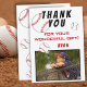 Baseball birthday thank you card with photo, thank you message, name and baseball balls. The card is in white, red and black colour scheme. On the back of the card are baeball balls. Photo thank you card - add your kids photo into the template. Personalize the card with name and your text. Great for kids who love baseball and sport.