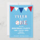 Cute Blue Baseball Birthday Invitation for boys 1st Birthday // Cute baseball birthday party card for the 1st birthday. The design has a large baseball and bunting flags in red, white and blue colours on a bright blue background. The back side has a baseball pattern. Personalize this birthday invite with a child`s name and a photo and personalize all the data on the invitation. Great as a boy 1st birthday party invitation.