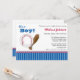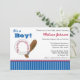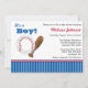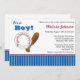 A baseball themed baby shower invitation in shades of blue, red and white. Perfect for a sports themed baby shower. Easily personalize for your party! Illustration by © Sanqunetti Design
