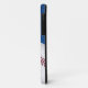 Custom baseball fan iPhone 5 case, with graphics of a blue on blue pattern background. Graphics of a baseball decorates the bottom right corner of the case and custom red coloured text, on the left side, is ready to personalize. Great phone case for the sports fan or baseball player.