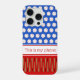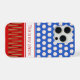 This baseball patterned phone case can also be personalized with your name or other text. There is a bright polka dot pattern of baseballs on a blue background, and a co-ordinating pattern of baseball bats on a red background.