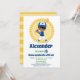 This boy's birthday invitation features a cute Hispanic baseball player in navy blue jersey with baseball bat on a yellow background.