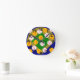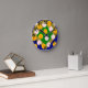 This wall clock has a ball themed design of a ball field made from diamonds and half-circle and baseballs and softballs made of circles with threads.