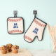 Red white and blue baseball / softball monogram oven mitts. Personalize the name and initial. Great gift for sports fans or players.