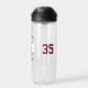 This baseball themed water bottle is suitable for boys or girls and features the realistic image of a clean white baseball, upon which you can personalize the athlete's name - customize the school or club name encircling the top of the baseball, team mascot name below, and jersey number on the sides of the bottle - by katz_d_zynes