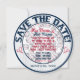 Baseball Wedding Themed-Round Save the date cards. The front side of the card is a photo insert/frame. Blue inner and outer rings with a personalized photo in the centre. Remove my photo insert and replace with a photo of your own. Decorative blue glass text circles around the top and reads: SAVE THE DATE. Another text area is on bottom for you to personalize with. Edit the date, write his and her names, etc. Delete/clear the text if you do not want it. This text is on both sides of the card. The outer rim background is blue and white baseball stripes. On the back side of the card you have the same text at top and bottom on a striped background. Little red heart embellishments sit between the words. The centre background is solid white with baseballs scattered throughout. Decorative glass text reads: HIM and HER (your names) are stepping up to home plate and batting 1000 that their love will last forever. The teams will merge into one on...your date.The baseball wedding themed invites are available in several mix and match patterns. These invites include the envelopes as well.