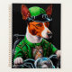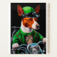 Un ami en fureur derrière les guidons d'une moto verte brillante, portant une tenue verte de la Saint Patrick qui fait tourner la tête. Le chien est habillé d'un ensemble festif, avec une cravate arc-en-ciel verte et un chapeau haut assorti qui se trouve doucement au-dessus de la tête. Le costume présente des motifs complexes de shamrocks et de leprechauns, ce qui indique clairement que ce chien est prêt à célébrer la Saint Patrick avec style.