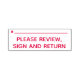 This plain rubber stamp design features the message "Please review, sign and return", along with a line that a signature or initials could be written above. It could perhaps be used by a teacher or an administrative professional to request that somebody review and acknowledge the contents of a document.