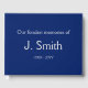 This plain funeral or memorial guestbook features the message "Our fondest memories of", and the personalized name and birth/death dates of the individual who has passed away. It features light grey text on a blue background. It could be used to record fond memories of somebody who has recently passed away.