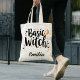 Modern Halloween custom tote bag design features "Basic Witch" text in black calligraphy-style typography. Makes for the best personalized Halloween gift for her - your friend, girlfriend, sister or even your neighbour! Perfect to make them feel special, boo