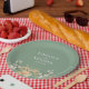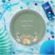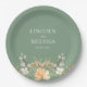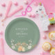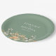 Pretty, modern and simple paper party plate features bottom floral spray with watercolor white and peach colour flowers and assorted sage and eucalyptus green leaves on trendy basil green background. Customize couple's name and wedding date in white modern fonts