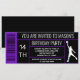 Basketball birthday party invitation with basket ball player on a black and purple shoe box label background. Simply add your event details.