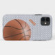 Custom basketball fan iPhone 5 case, with graphics of a light grey sports jersey pattern background. Graphics of a basket ball decorates the bottom right corner of the case and custom rust coloured text, on the left side, is ready to personalize. Great phone case for the sports fan or basketball player.