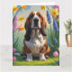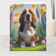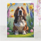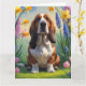 A cheerful dog sits peacefully on lush green grass, surrounded by colourful spring blooms under a soft blue sky. This digital oil painting captures a serene moment with expressive brushstrokes, warm colours, and a sense of gentle joy.