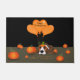 This design features a Basset Hound dog wearing a pumpkin hat costume surrounded by some pumpkins and balloons.