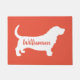 Basset Hound Lover's Welcome Mat Bright Orange Red and White. Personalize with your family name, Welcome, or delete the default text if you prefer no text at all. This cool Basset Hound design makes a wonderful gift for a housewarming party, newlyweds, holidays and most any occasion. More colours are available. Visit Jenn's Doodle World for even more dog breed themed doormats and home decor.