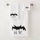 Bath towel set, consisting of a face cloth, hand towel and bath towel with a bat design. You can have this bath towel set in any colour by changing the background just click the edit this design button and choose the colour of your choice. You can also customise the text to read whatever you want. Should you require any help with customising then contact us through the message link on this page. Bat design bathroom towel set