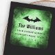 Halloween return address labels featuring a flying bat silhouette. Below is the name or family name in a gothic style font and the return address on a green and black, distressed grunge background.