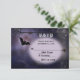 RSVP card for your spooky Halloween or Gothic themed event. Black bat with outstretched wings flying against a gloomy and cloudy grey and white background. Ornate steel bar at the top has a few spiders and a giant spider web. Perfect RSVP card for your spooky wedding reception or event. Easily change text on this design to match your theme.