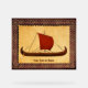 Un Viking long navire avec une voile rouge vu en profil du côté droit. Il est superposé sur une image arrière - plan en papier ancienne et il y a aussi un cadre en bois finement sculpté. Customisez en ajoutant votre propre texte supplémentaire.