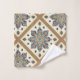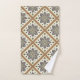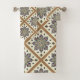 This fresh Bath towel set features multicolored medallion tiles arranged diagonally. I rich tan line divides and frames each medallion to create a trellis effect. This design comes from actual handmade tile. This is from Oregon Tile maker Fayjones Day.