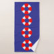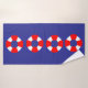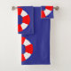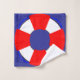 Bathroom towel set with a nautical design featuring red and white life preservers arranged in patterns against a blue background.
