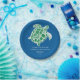 A green batik-like loggerhead sea turtle on a royal blue background serves as a customizable kids or Adults Birthday Party Paper Plates. Perfect for the marine conservationist or future marine biologist.
