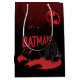 This atmospheric graphic captures Batman standing resolute under a blood-red sky, an iconic and powerful image of vigilance. The scene is bathed in a monochromatic red tone, highlighted by the stark contrast of Batman's silhouette against the vibrant backdrop. The Bat-Signal is distorted and fragmented in the sky, suggesting Gotham's chaotic state, while rain falls heavily, adding a sense of urgency and foreboding to the scene. Bats flutter in the stormy sky, symbolizing Batman’s constant companions in his endless night watch. The bold "BATMAN" lettering at the forefront anchors the composition, emphasizing the Dark Knight's central role in the fight against crime. This piece conveys the grit, determination, and the ever-present sense of danger that Batman faces in his ceaseless watch over Gotham City.