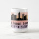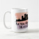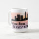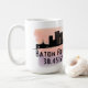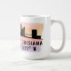 Coffee mug features skyline silhouette of Baton Rouge Louisiana with map coordinates and a watercolor splash background.