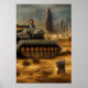 Battle field out side the city of Novum Desertum, a tank driver away and a small mech walking away a city in the background and a dusty sky over the city. This is a AI generated art.