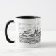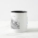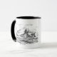 Mug with drawing and coat of arms of the famous German battleship Bismarck of world war II with the name of the ship written with fraktur letters.